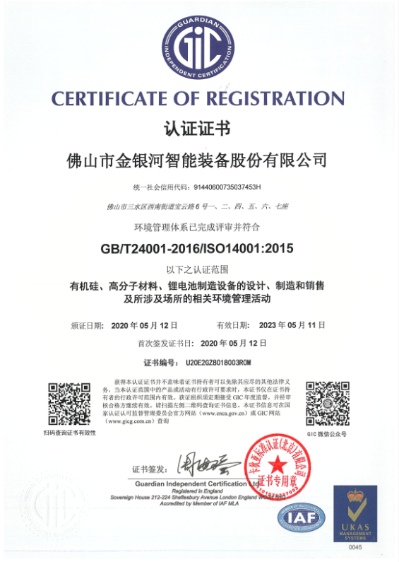 2020年5月,操逼APP下载大全“環境管理體係”完成評審並符合GB/T24001-2016/ISO 14001:2015,認證範圍包括黄色操逼视频软件、高分子材料、鋰電池製造設備的設計、製造和銷售及所涉及場所的相關職業健康安全管理活動。