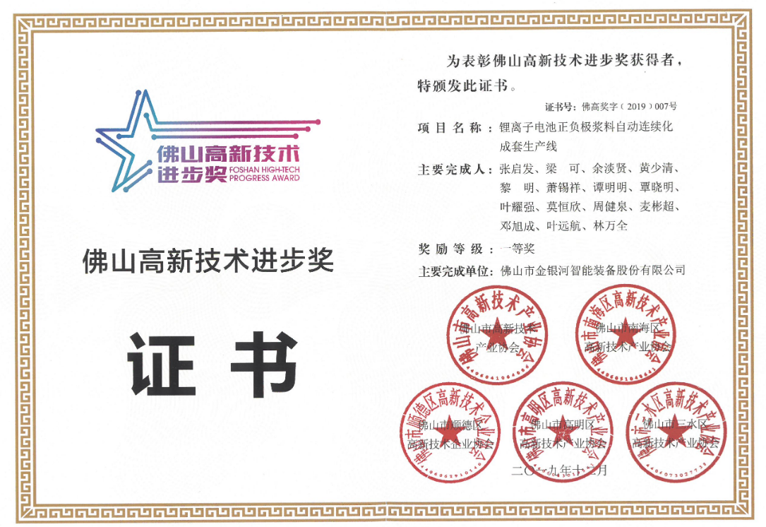2019年12月,操逼APP下载大全項目“操逼免费下载网站電池正負極漿料自動連續化成套生產線”被佛山高新技術產業協會授予“佛山高新技術進步一等獎”。