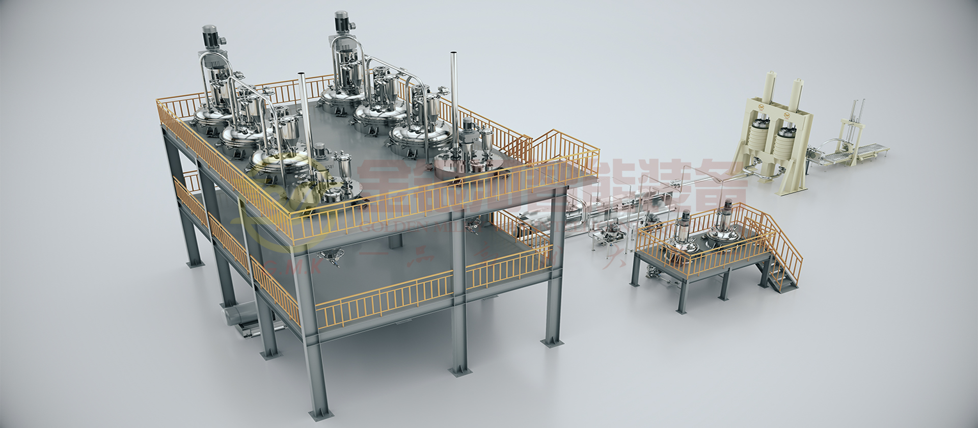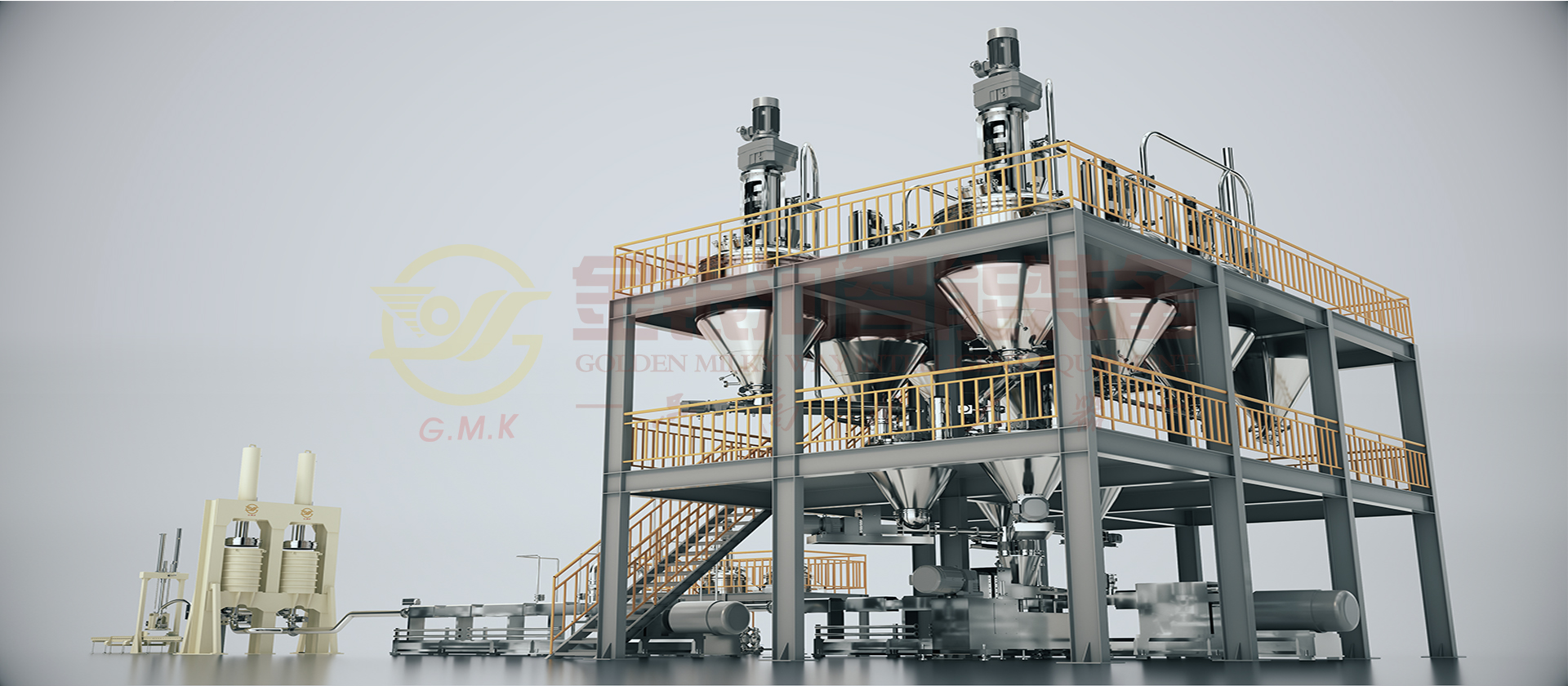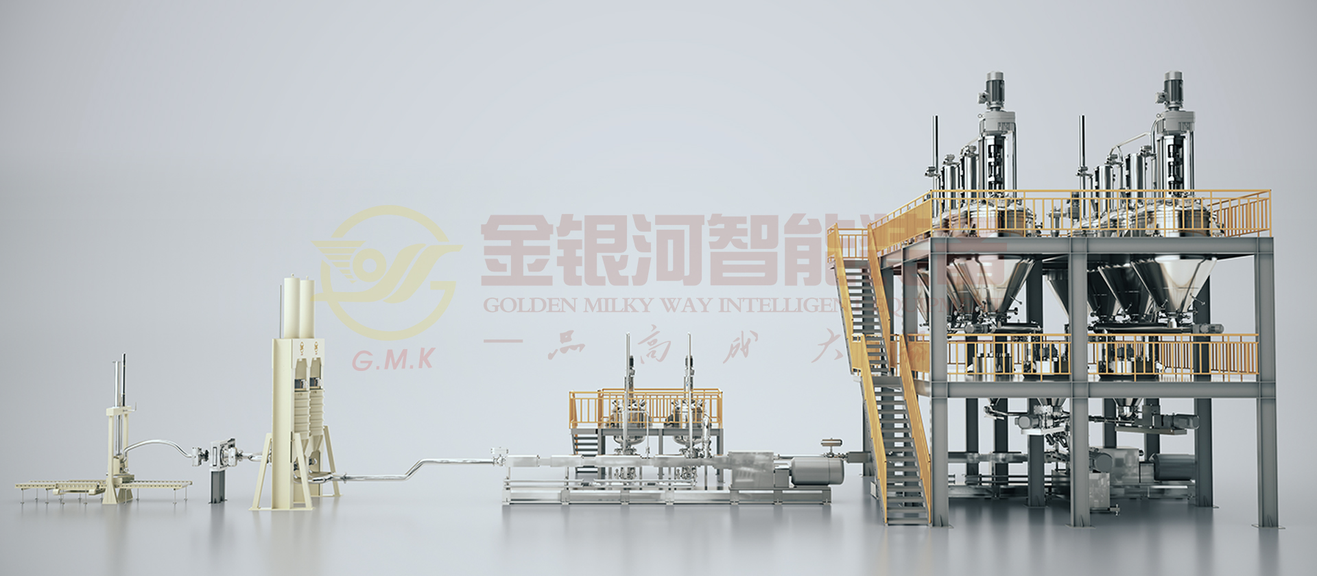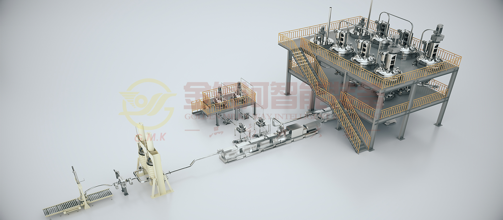 由計量鬥、稱量及輸送係統、貯罐、冷卻器、多工位出料機、喂料機、雙螺杆螺旋混合機、在線烘幹、冷卻粉體裝置、輔助設備及DCS中央控製係統組成。原材料(粉體與液體)通過精確的計量係統在線自動和連續輸送到螺旋混合機中,在一階螺旋混合機中完成混合、分散、研磨、抽真空等產出基料後入二階螺旋混合機,通過在線加入助劑至其中,再次完成混合、分散、研磨、抽真空等完成品料製作並輸出進入多工位出料機暫存,多工位機出料機輪流交替出料過濾包裝。它的生產效率高,適合大規模生產;它具有自動化程度高,杜絕物料直接接觸空氣,產品質量穩定性好,物料及能源損耗少等優點。