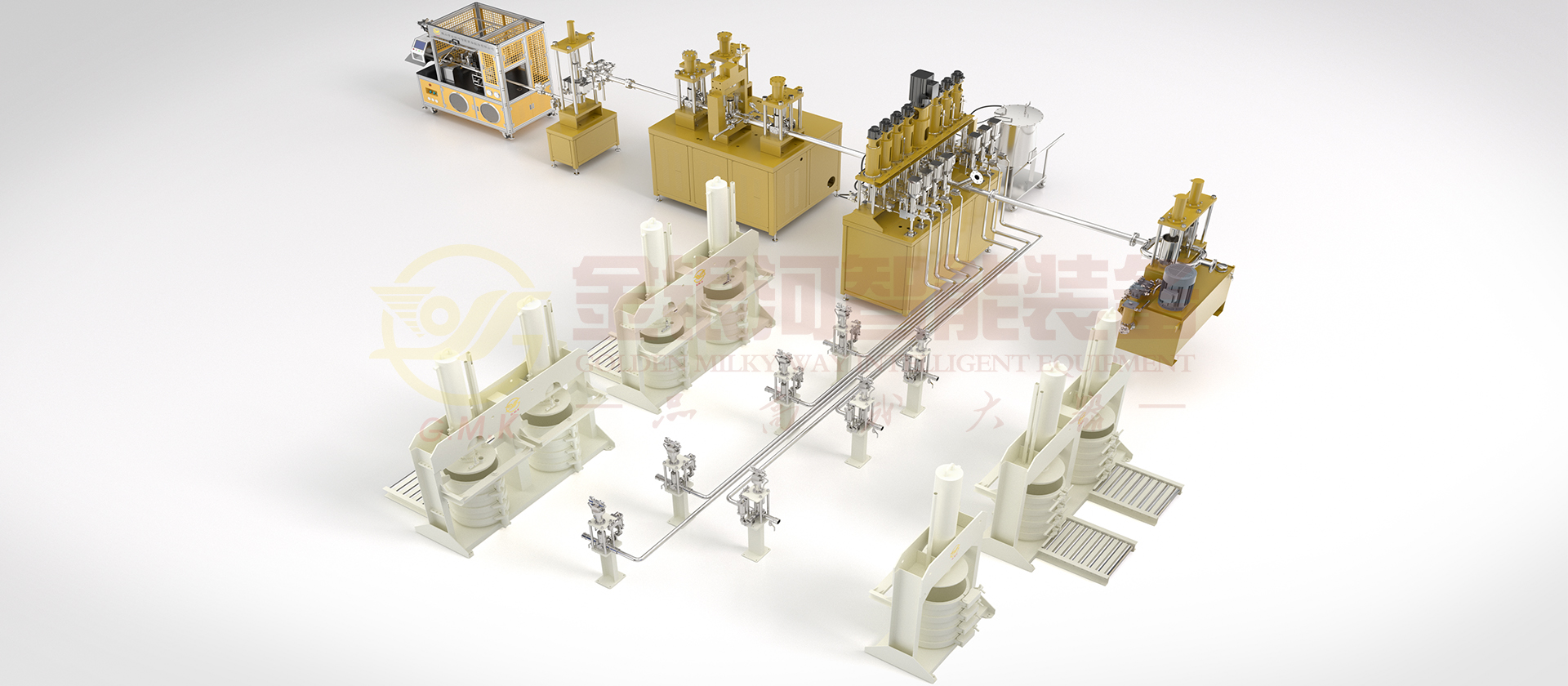 醇型智能調色線是一種新穎的靜態混合機,特別適合於批量小、顏色種類多的雜色膠的連續化生產。它由色漿供料係統、色漿伺服定量係統、基膠伺服定量係統、靜態混合芯、靜態混合增壓係統、循環係統、脫泡係統、液壓係統、集成電控係統、氣控係統、機架等部件組成,其中伺服定量係統、靜態增壓混合器、脫泡係統是整套設備的關鍵部件,也是保證產品質量穩定、均勻、可靠的保障。