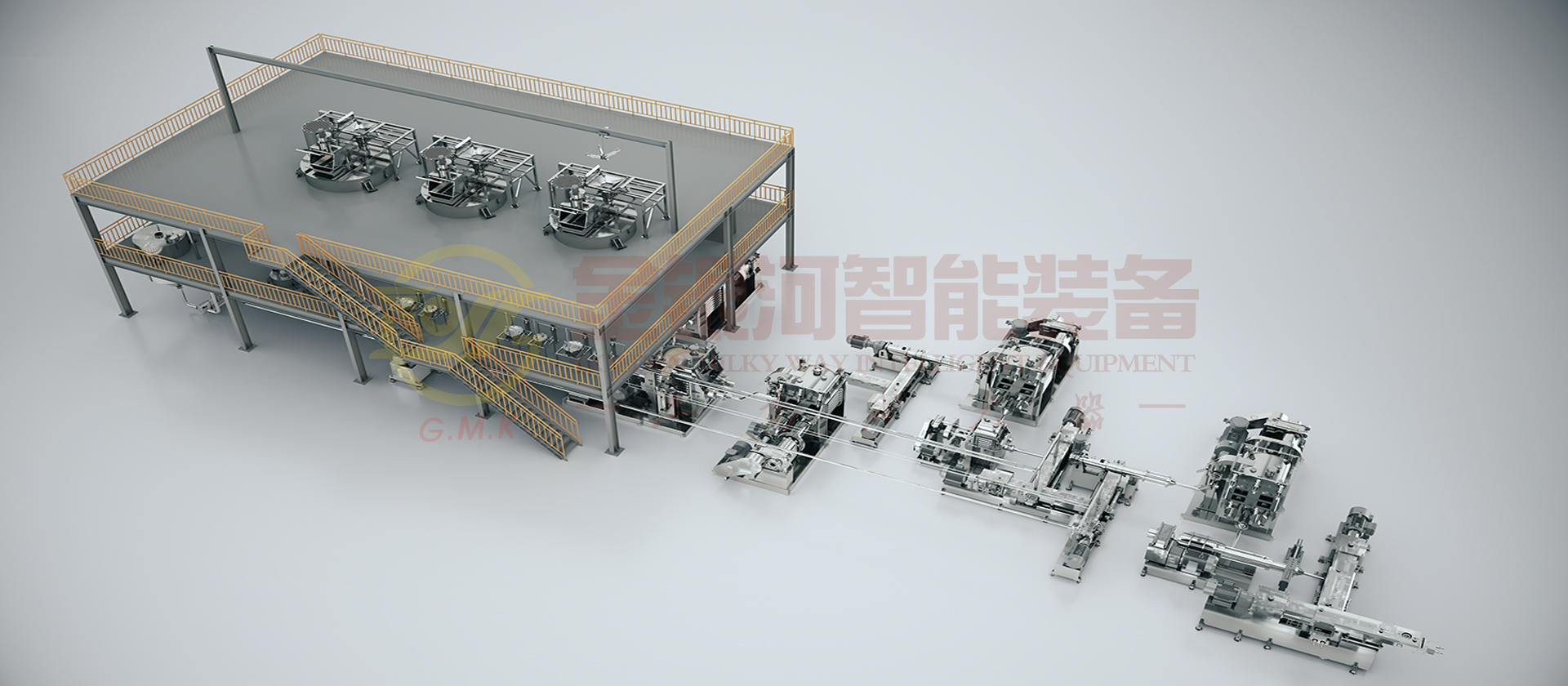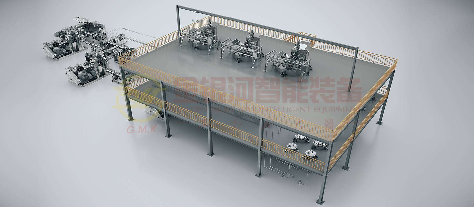 由計量鬥、稱量及輸送係統、貯罐、多工位出料機,增壓機、靜態混合機、雙螺杆螺旋混合機、輔助設備及DCS中央控製係統組成。液體的原材料(粉體與液體)通過精確的計量係統在線自動和連續輸送到螺旋混合機中,液體膠的原材料(粉體與液體)通過精確的計量係統在線自動和連續輸送到螺旋混合機中,分三段完成粉液混合,對產能大大提高,產出基料後進入多工位機臨存反應,再通過雙螺杆螺旋混合機完成混合、分散、研磨、抽真空等完成基膠後進入在線靜態混合機加入助劑再次混合,經雙螺杆螺旋混合機在線冷卻後包裝。它的生產效率高,適合大規模生產;它具有自動化程度高,杜絕物料直接接觸空氣,產品質量穩定性好,物料及能源損耗少等優點。