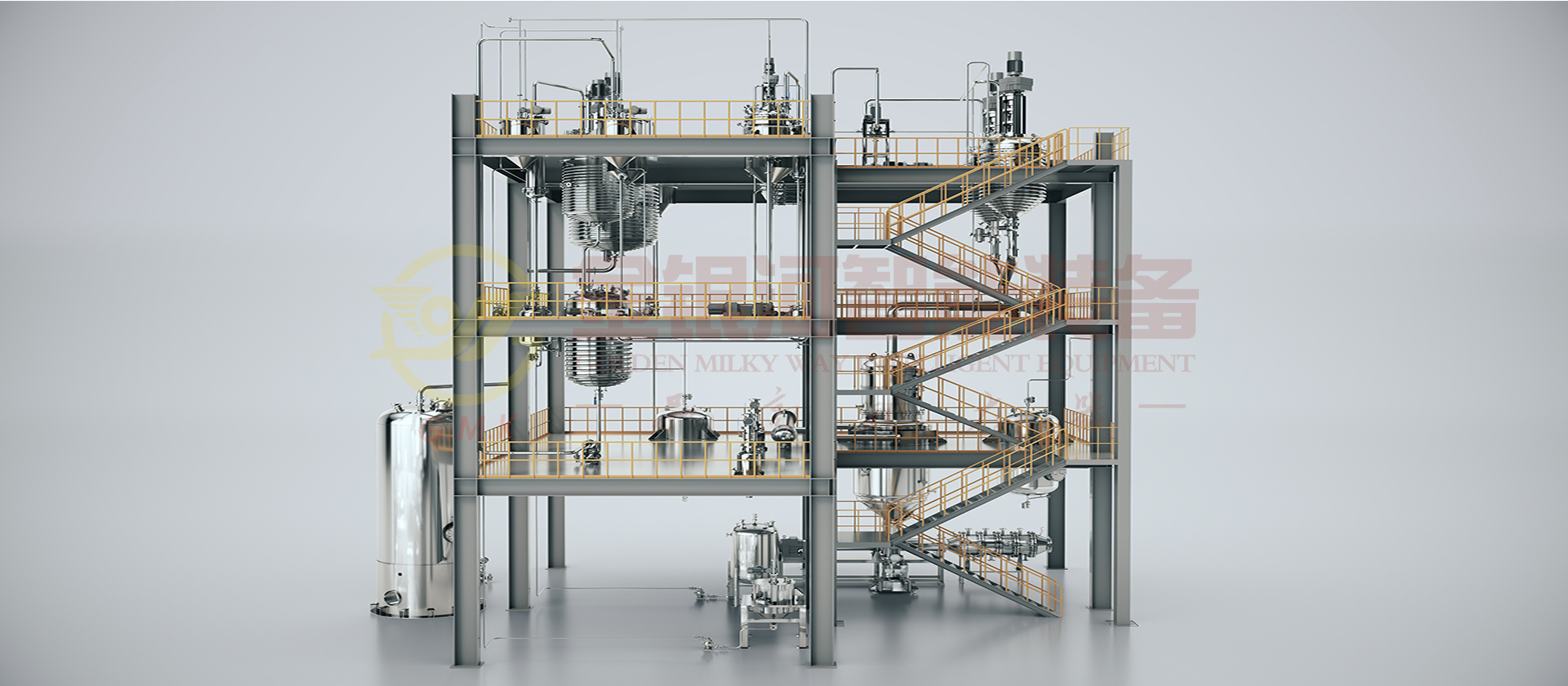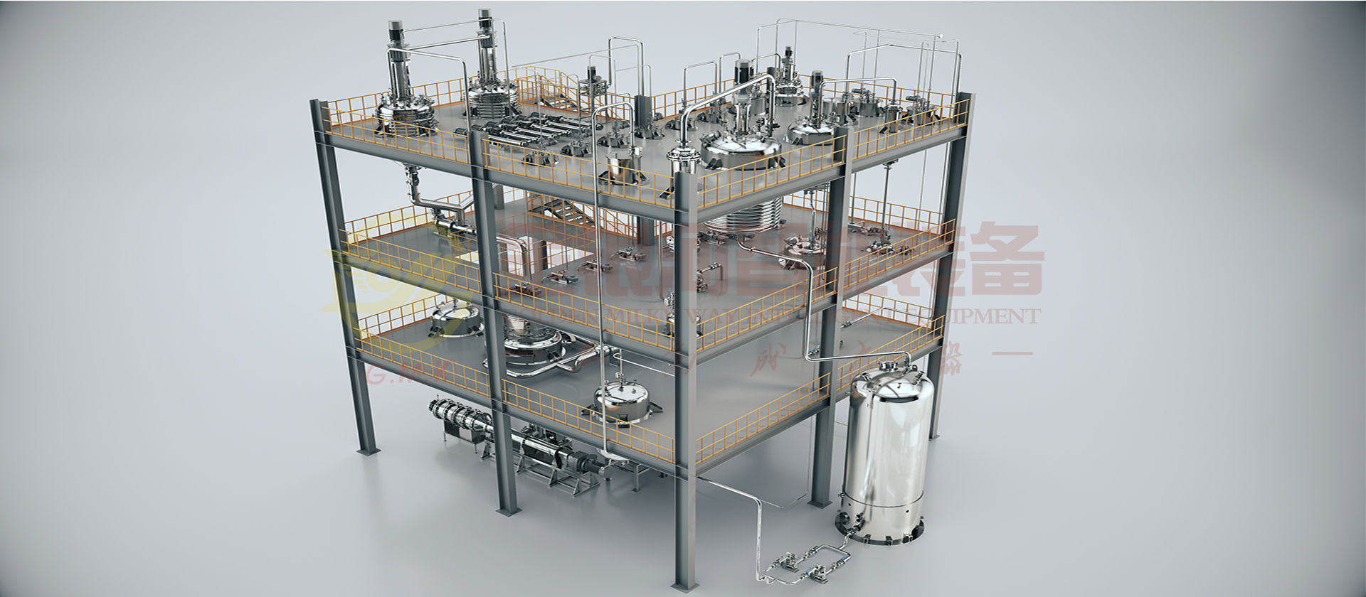 由計量鬥、稱量及輸送係統、貯罐、加熱器、冷卻器、在線混合單螺杆、聚合反應釜、脫低分子器、單螺杆出膠機、輔助設備及DCS中央控製係統組成。生膠的原材料(液體)通過精確的計量係統在線自動和連續加入至混合單螺杆中,前期可先通過加熱器預熱已脫水的DMC,縮短液體料在混合單螺杆中的反應時間後進入混合單螺杆機中,並同時在線加入堿膠、乙烯基矽油、封頭油等液體料,通過加熱升溫,使其在混合單螺杆機中完成聚合反應後進入聚合釜內(多台釜輪流切換使用,達到不停機效果),後送料至脫低分子器加熱升溫,抽真空脫低得到產品,並通過單螺杆出膠機把產品推送到冷卻器冷卻出料包裝,單螺杆出膠機可實現同時抽真空同時出料的功能,真正做到連續自動化。它的生產效率高,適合大規模生產;它具有自動化程度高,杜絕物料直接接觸空氣,產品質量穩定性好,物料及能源損耗少等優點。