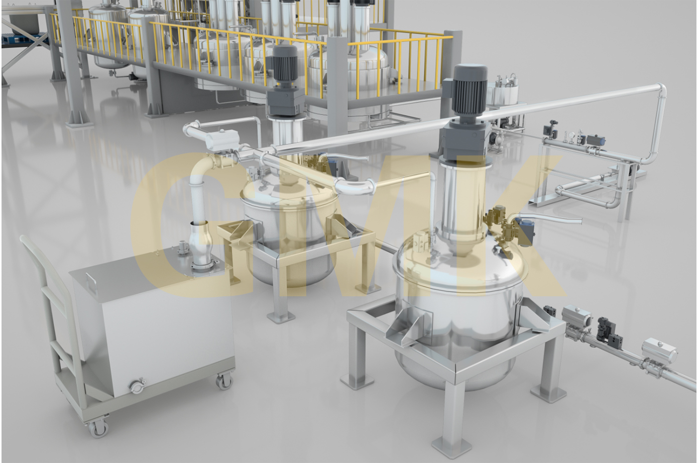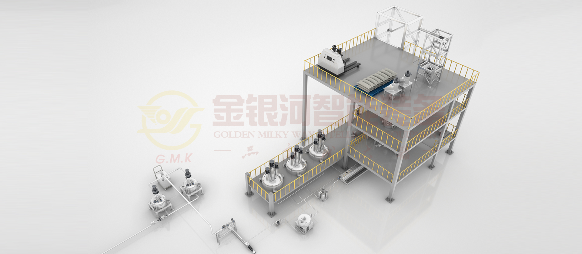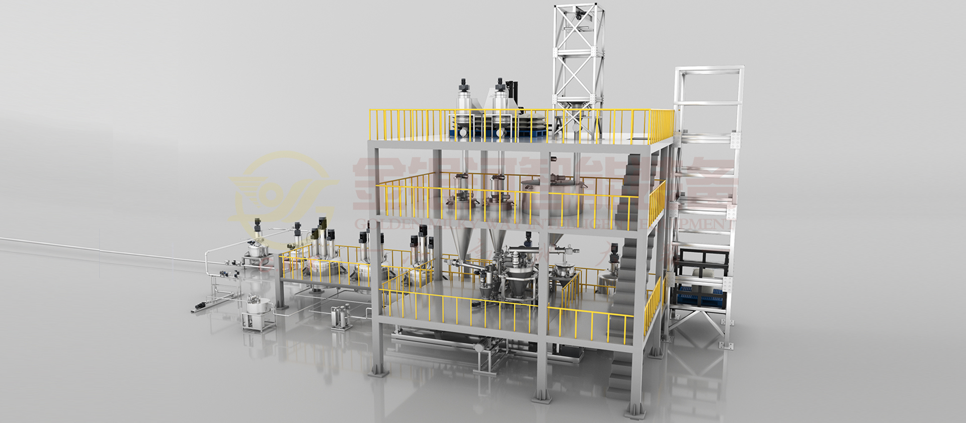 由計量鬥、稱量及輸送係統、貯罐、製膠罐、中轉罐、喂料機、高速混料機、增壓泵、磁性式過濾器、高速均質機、輔助設備及DCS中央控製係統組成。鋰電池的正、負極原材料(粉體與液體)通過精確的計量係統在線自動和連續輸送到螺旋混合機中、在螺旋混合機中完成混合、分散、研磨、抽真空等操作形成漿料,然後漿料連續從螺旋混合機中輸出進入下道生產工序。它的生產效率高,適合大規模生產;它具有自動化程度高,杜絕物料直接接觸空氣,產品質量穩定性好,物料及能源損耗少等優點。
