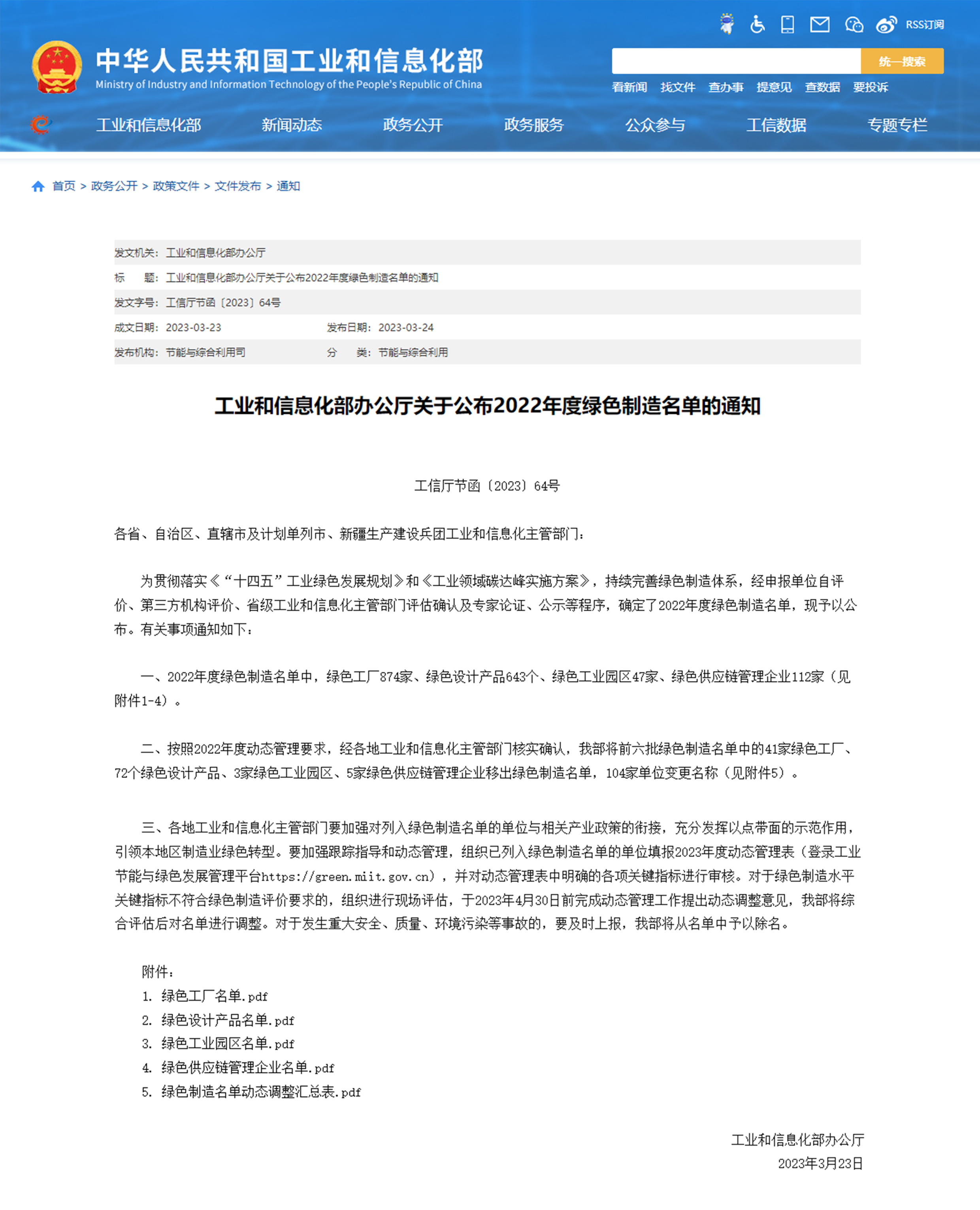 國家工業和信息化部開展綠色製造名單評選,旨在貫徹落實《“十四五”工業綠色發展規劃》,全麵推行綠色製造,助力工業領域實現碳達峰、碳中和目標。本次公布的2022年度綠色製造名單中,綠色工廠874家、綠色設計產品643個、綠色工業園區47家、綠色供應鏈管理企業112家。